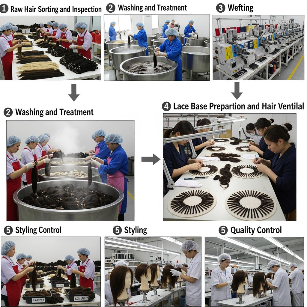 Most production lines follow an “action + check” rhythm: define specs → prepare materials → build cap → ventilate hair → finish hairline → wash/style → final QC → pack. The key is that each step creates outputs that can be verified before moving forward.