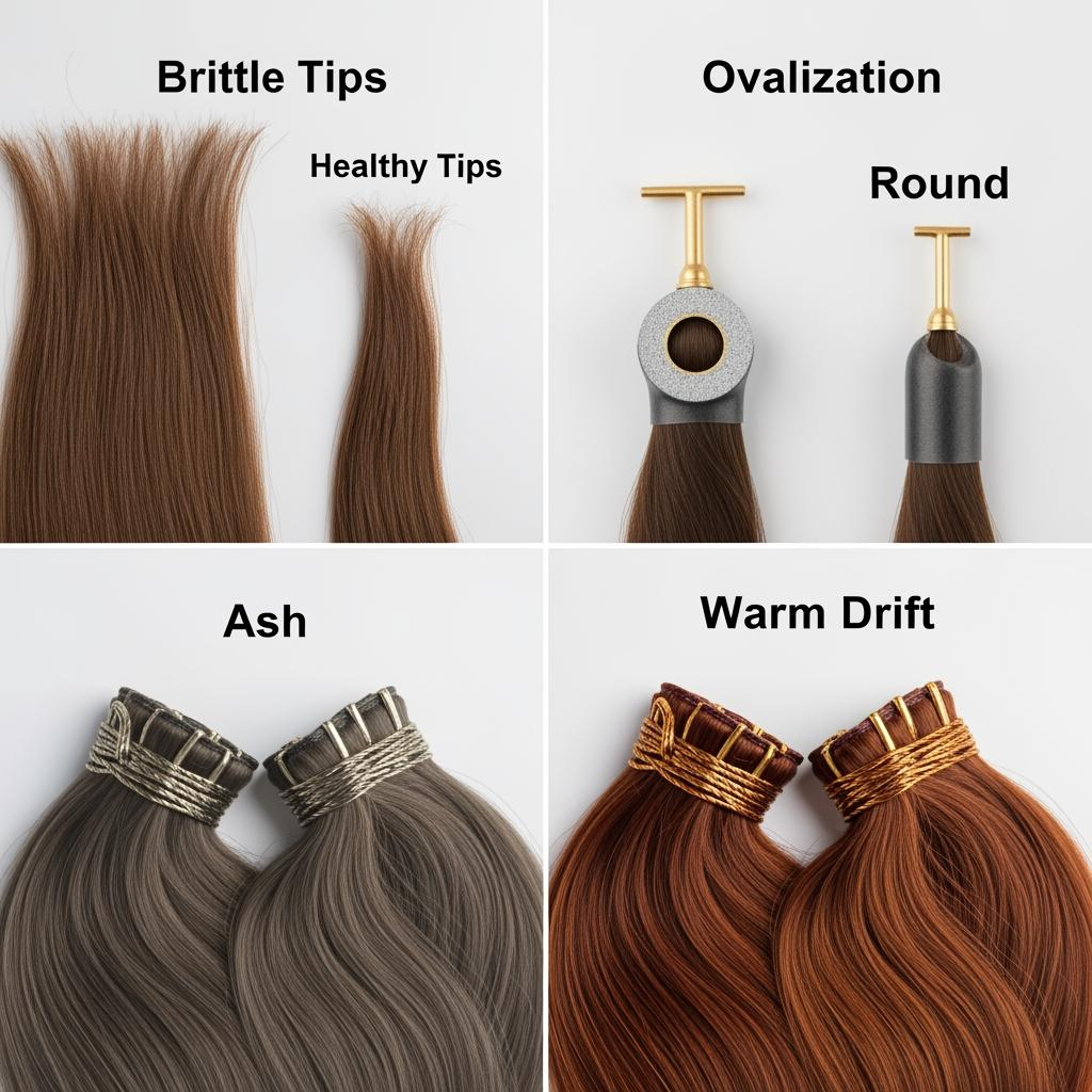 Brittle tips are the number-one install killer. If keratin is overheated or overfilled with filler, cylinders crack under bead pressure and shed early; catch this with a flex test and a light heat tap during sampling. Ovalized tips happen when trays or cartons compress in transit—spec rigid, partitioned trays and ask for a carton drop test report. Color drift in browns—particularly ash—shows up as unwanted warmth in salon lighting; require daylight and 5000K LED swatches for every dye bath, and keep a master sample for side-by-side checks. Excess silicone can fake “silky” straightness but washes off, revealing dryness; co-wash samples and evaluate hand feel and shine under neutral light.