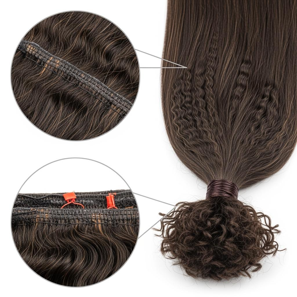 Virgin, cuticle-aligned input hairs reduce frizz, preserve undertone, and tolerate repeat low-heat styling—critical for kinky straight extensions that double as heat-styled looks. Ask suppliers to restate your spec in their words: grams-by-length, double-drawn ratio, acceptable luster range, press test temperature, and pack-out standard. Then judge performance after washing, not from factory styling. Honest 1B undertone should stay neutral under window light; luster should remain satin at most; and the texture should pass a single-swipe flat-iron test without snagging or squeaking.