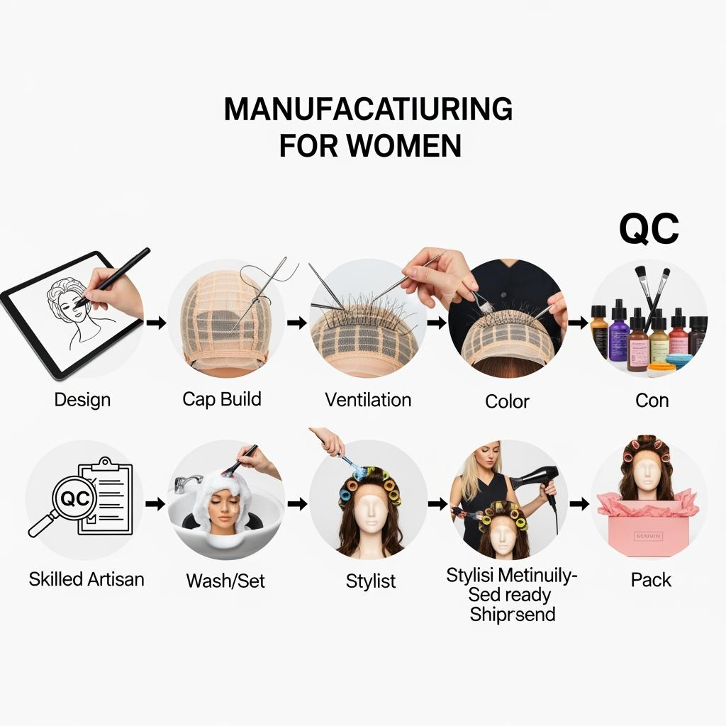 Understanding the process helps you predict where variation can creep in. Most custom wig manufacturing includes material preparation, ventilation or machine work (depending on style), cap construction, hairline detailing, coloring, washing/setting, QC, and packaging.