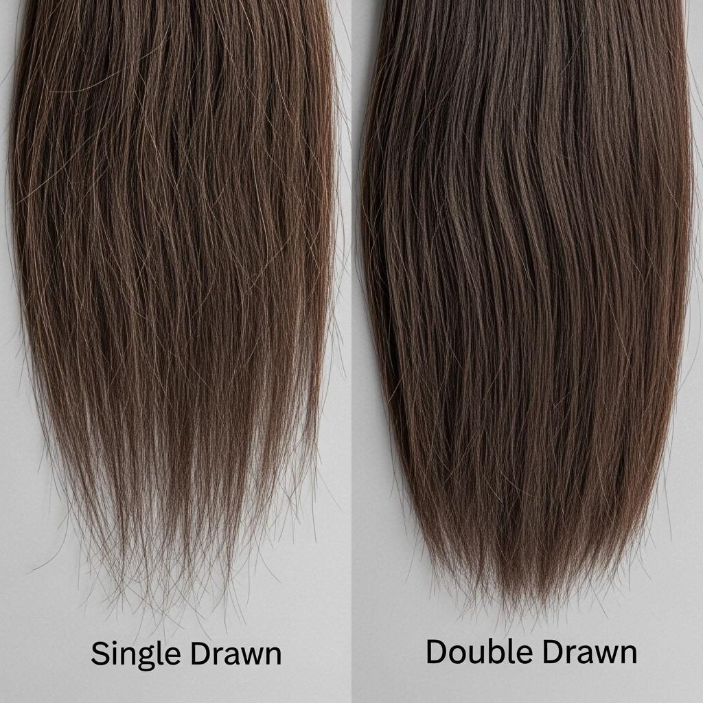 “Double drawn” should be obvious in the hand. When you pinch a bundle mid-length and let the ends fall, the volume should stay nearly as full at the tips as it is at the roots. In practice, top vendors achieve this by trimming out shorter strands and aligning cuticles to reduce frizz and tangling. Ask for a side-by-side of raw bundle before trimming and the finished double drawn bundle; consistent end thickness, not just density at the weft, signals real double drawn work.
