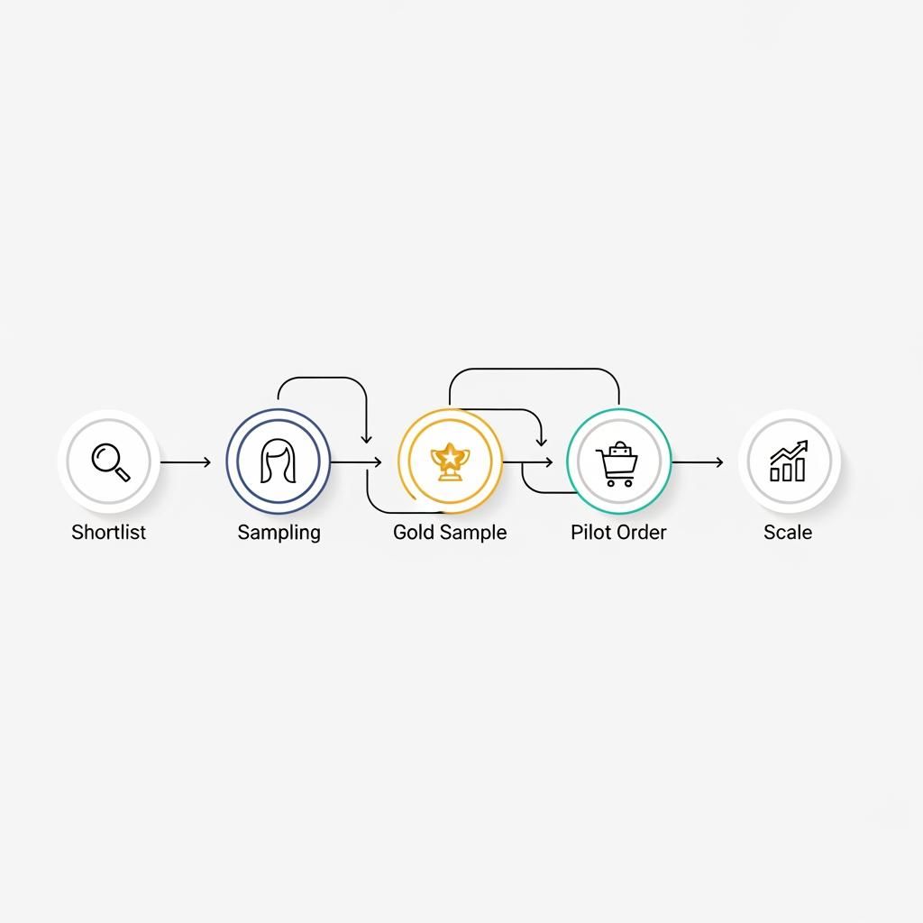 Shortlist 6–8 candidates, run a standardized sample round with a scoring sheet, freeze a gold sample, then place a 30–50 unit pilot before scaling.