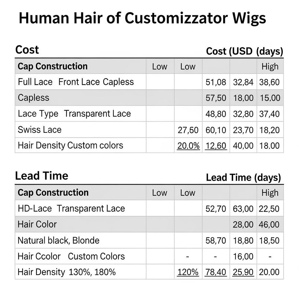 Customization adds both cost and lead time, especially for lace upgrades, special caps, and complex color. Ask for “upgrade deltas” so you can price product tiers without re-quoting every variant.