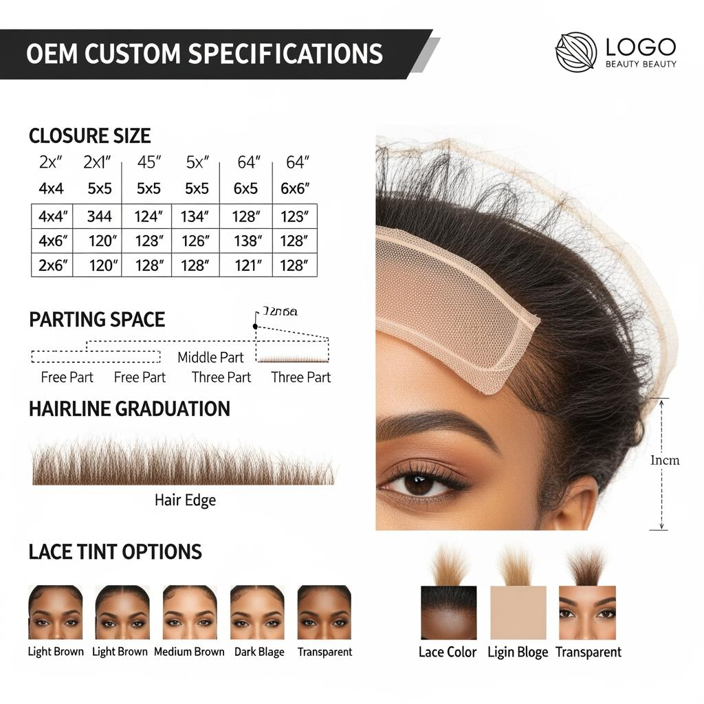 Start with the base architecture: closure size (4×4, 5×5, 6×6, etc.), free part vs defined part, and hair direction/ventilation pattern. Then define hairline: graduated density, baby hair approach (if any), and symmetry. Finally, define finish: knot bleaching level, lace edge finishing, and any pre-cut options (only if you’re confident in standardization).