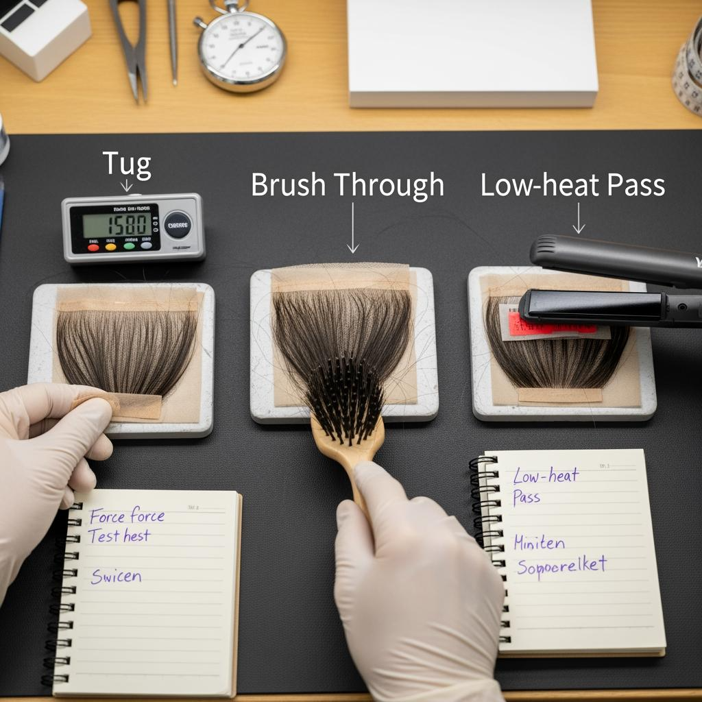 | Knot strength vs. size | Balance realism and durability | Tug test at hairline and mid-zone; shedding count | No popped knots; minimal shedding after 20–30 strokes |