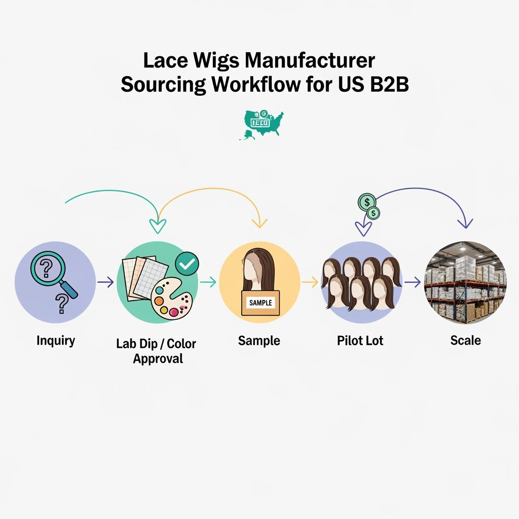 Start by standardizing your request. Provide one wig spec sheet and one highlight reference pack (photos, shade names you use internally, and what “too warm/too ashy” looks like). Ask the supplier to confirm in writing before they quote. Then move through a simple action + check flow: share spec → confirm color approach → approve lab dip or color swatch → approve pre-production sample → run pilot lot → audit inbound QC → scale.