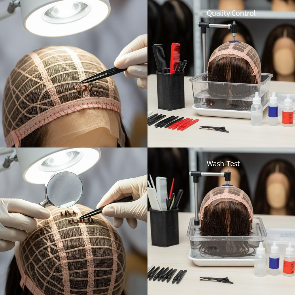 Use a standard receiving routine. Check lace characteristics under neutral light (how it disappears on a mannequin head or skin-tone card), evaluate knot finish consistency, and inspect stitching and cap symmetry. Then do at least one wash-and-comb test per key SKU per batch—because “high quality” should survive normal care.