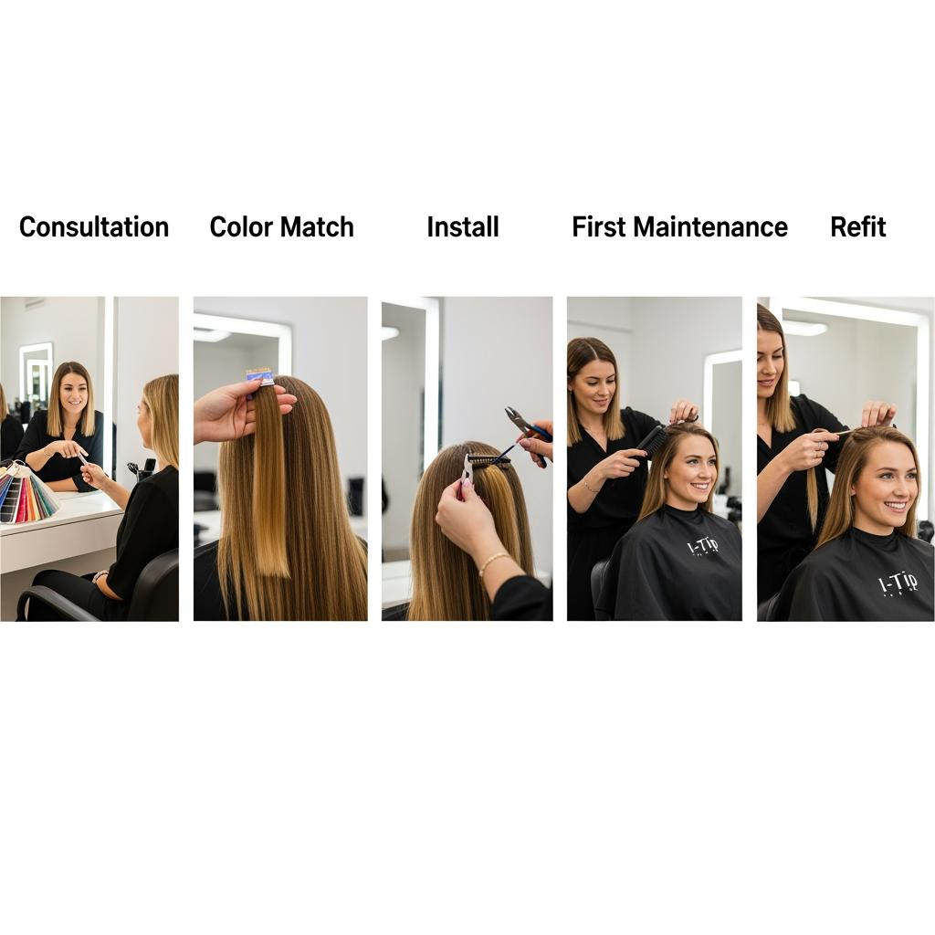 I-Tips provide strand-by-strand movement and 360-degree styling freedom without tape or heat-based keratin bonds. The small cylinders distribute weight gently and can be adjusted during maintenance, making them a comfort-forward choice for clients who ponytail, work out, or live in humid climates. Stylists can blend density exactly where it’s needed—temples, crown, or mid-lengths—so results look natural even at close range. Properly installed I-Tips protect the natural hair with controlled tension and clear regrowth paths, while predictable maintenance intervals create a smooth service rhythm for both client and salon.