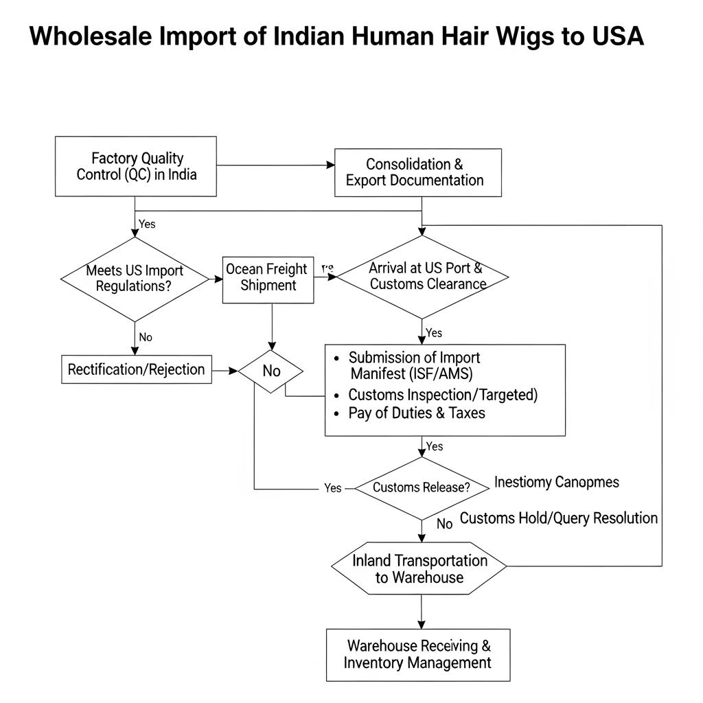 A reliable flow looks like: confirm product specs and labeling → approve golden samples → place PO with agreed incoterms → production with in-process checkpoints → pre-shipment inspection → book freight → customs clearance → US receiving inspection → inventory release. For first-time suppliers, add time for revisions and for confirming packing methods that protect lace and hair texture.