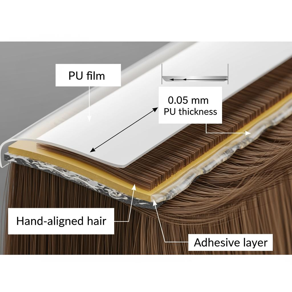 Invisible tape construction is a thin, translucent PU (polyurethane) tab that encapsulates aligned human hair, presenting a “hair‑out” face so the seam visually disappears in partings. The build succeeds or fails on three pillars: a supple PU film that flexes with the head without printing, true Remy alignment that resists reverse‑cuticle snag, and a tab profile thin enough to vanish yet strong enough to resist delamination.