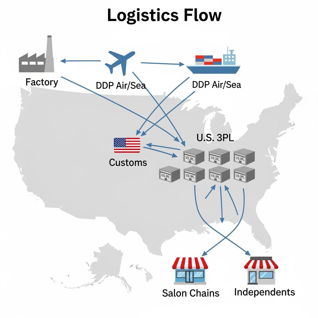 Use DDP sea for core replenishment and DDP air for launches and spikes, then stock a U.S. 3PL to ship salon refills and handle RMAs quickly.