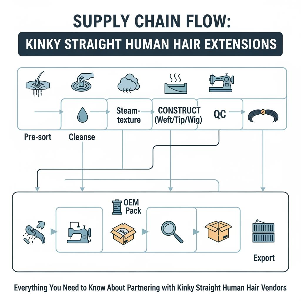 From fiber sourcing to retail-ready inventory, each stage affects consistency. Vendors typically pre-sort by length and shade, cleanse and condition, then steam-texturize to achieve the kinky straight pattern. Wefting or tip bonding follows, along with trimming and final conditioning. Inline QC checks confirm density, stitch or bond integrity, and texture rebound after a rinse. Finished goods flow into OEM packaging where barcodes, inserts, and box art are applied, then move to export with accurate commercial documents and ASNs.