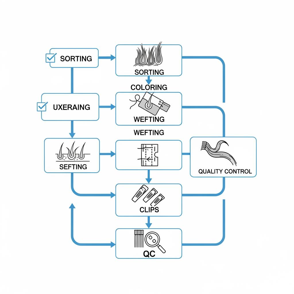 Ask the factory to map their workflow at a high level: hair selection → sorting/alignment → coloring (if applicable) → wefting → clip attachment → final QC → packing. Then ask which steps are in-house and which are outsourced. In-house control usually improves consistency; outsourced steps can be fine, but only if the factory manages them tightly and can still trace batches.