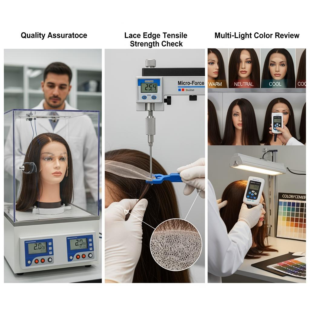 Run heat-cycle tests within the claimed range, multi-light color checks, lace tensile tests after pre-plucking, and post-wash shedding/tangle assessments against your gold sample.