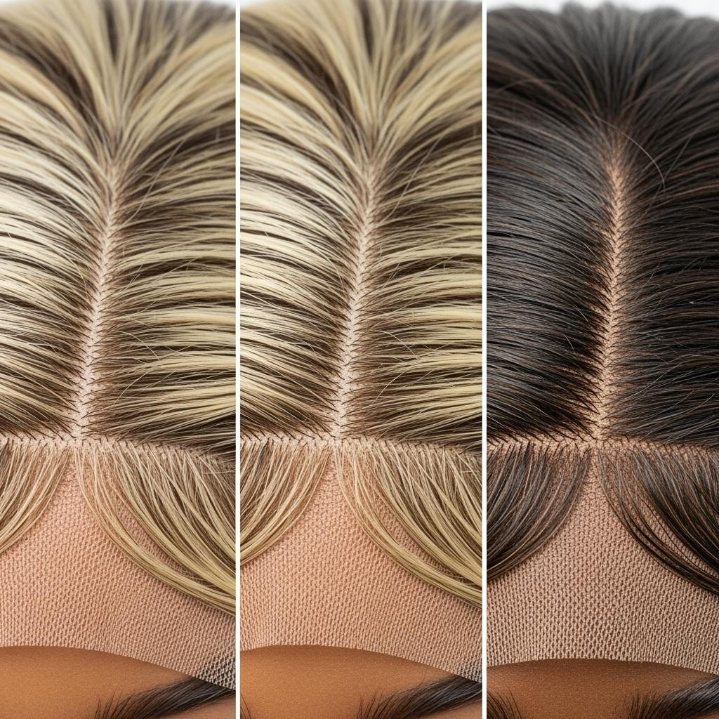 Color blending is first. Mixed blonde-on-brown should read intentional and soft, not streaky or brassy. A slightly deeper root smudge helps the lace edge disappear, with micro-highlights around the face to brighten without washing out the hairline. Check that blonde panels are neutralized to avoid orange under LED.
