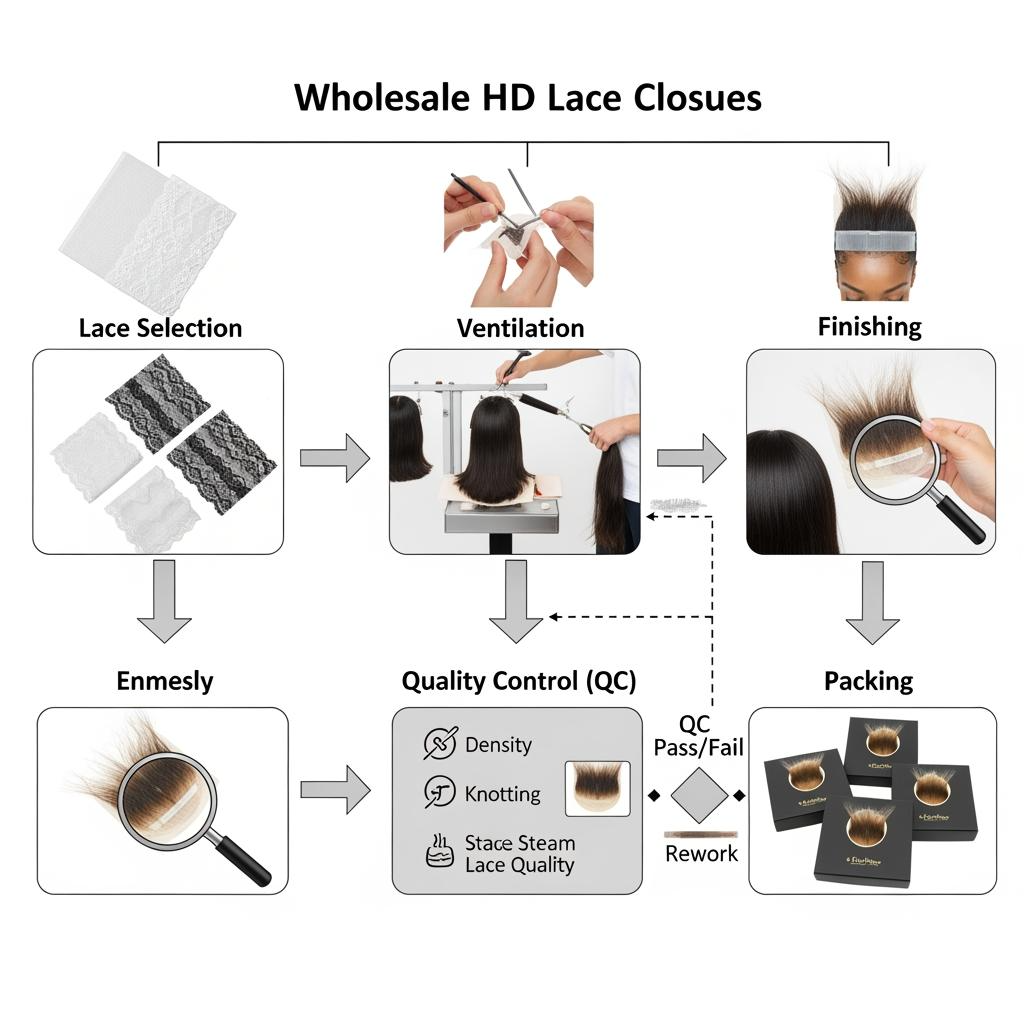 Knowing the manufacturing flow helps you prevent quality drift. Most closure problems map back to a few steps: lace selection, ventilation (how hair is knotted into the lace), knot finishing, and final inspection/packing. If any of these are inconsistent, your bulk order becomes inconsistent.