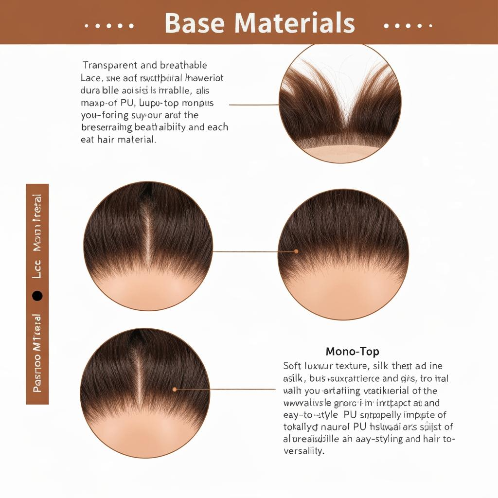 Material choices define both the look and the user experience. In toppers, “material” includes the hair fiber (synthetic vs human hair) and the base construction materials (lace, mono, silk-like layers, PU edges, etc.).