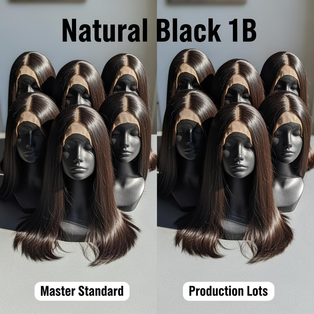 Color 1B is natural black with a soft brown undertone—not jet black—and real consistency starts with a master standard and controlled viewing. Approve a master 1B swatch photographed and examined in daylight conditions after a wash-and-air-dry, then require every batch to be matched against it in a light booth set to daylight-equivalent settings. Because coatings can temporarily deepen tone, evaluate color after cleansing to reveal the true finish, not the factory sheen.