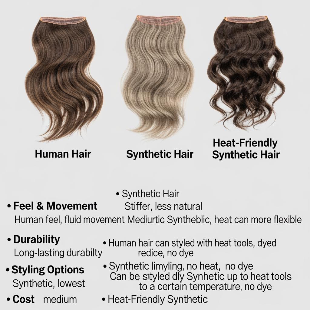 Human hair is valued for natural movement and styling options, but it requires more care and consistent sourcing to avoid batch variation. Synthetic fibre is often the most consistent at scale and can be very beginner-friendly—especially for pre-styled looks—though it may frizz sooner depending on fibre type and daily friction points like collars and seatbelts. Heat-friendly fibres sit in the middle: more styling flexibility than standard synthetic, but they can be sensitive to temperature and technique.